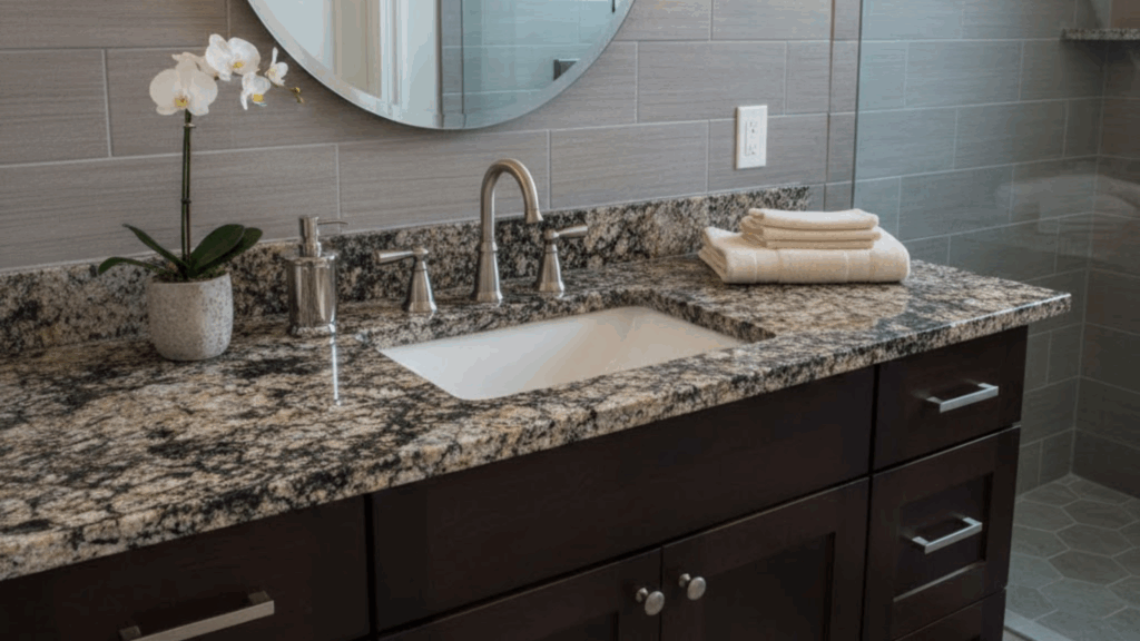 Granite is a natural stone which has a reputation for strength and is resistant to heat. Each granite slab is unique, adding character to a bathroom vanity with sink. It needs to be occasionally sealed to keep it waterproof, and the weight is heavy, requiring solid cabinetry. Granite remains a premium but dependable choice for luxury bathroom vanities.