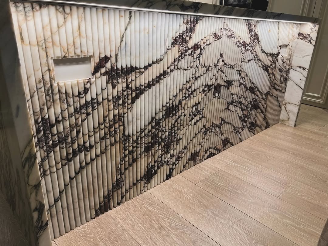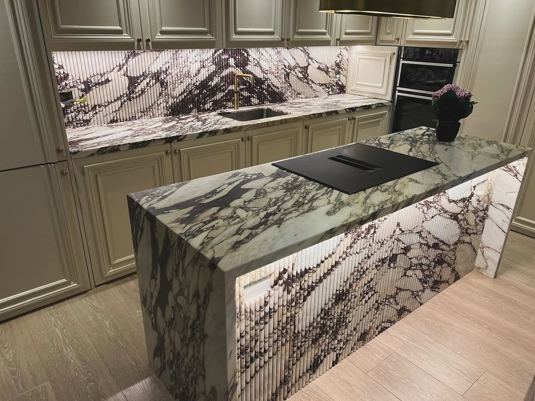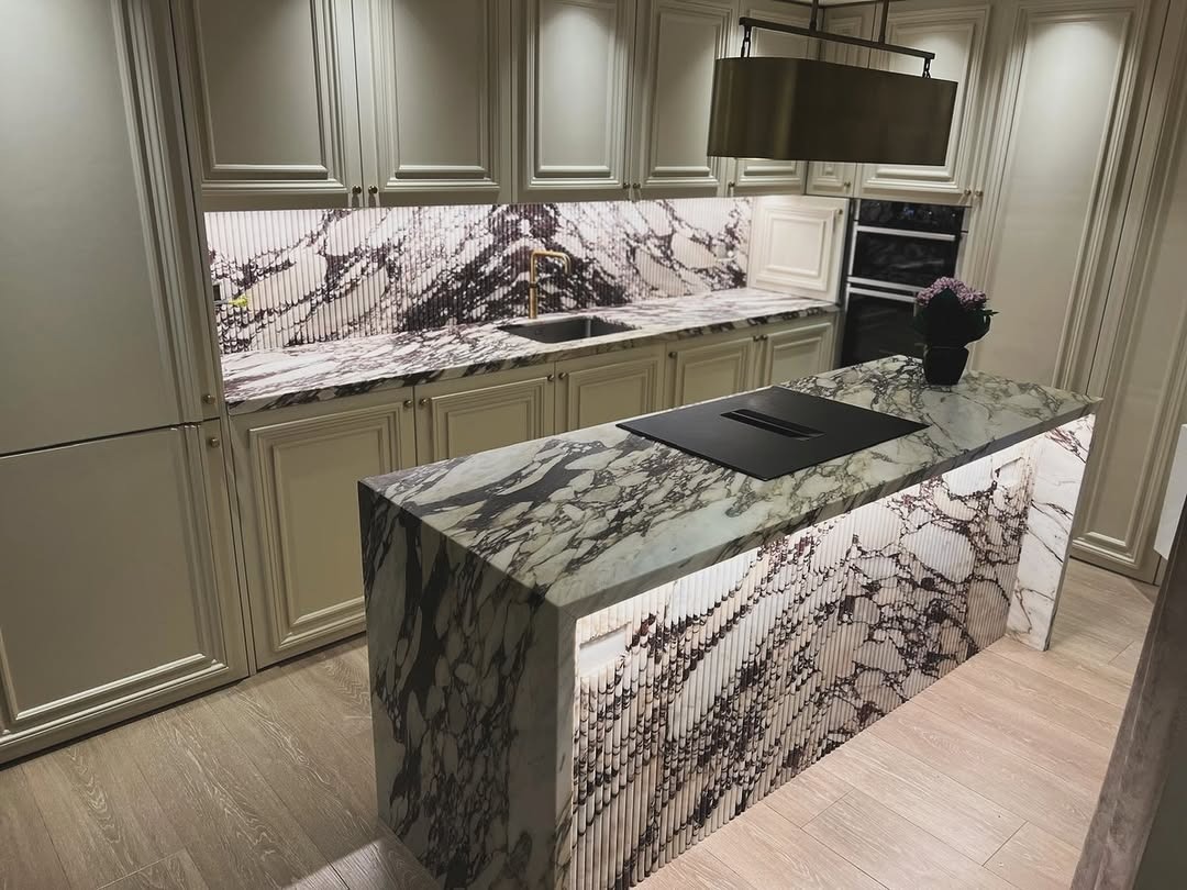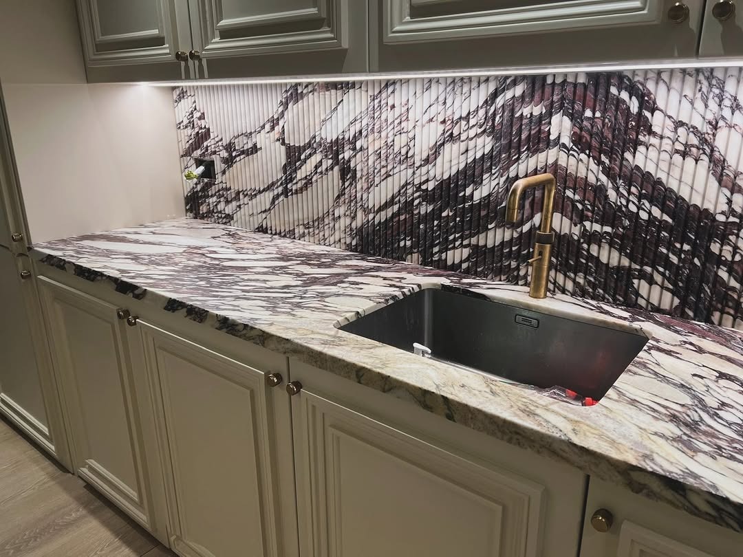 Our latest bespoke kitchen worktop project showcases the exceptional beauty of Calacatta Viola marble, one of the most sought-after stones in luxury kitchen design. Known for its dramatic violet and gold veining set against a crisp white background, every slab is entirely unique.